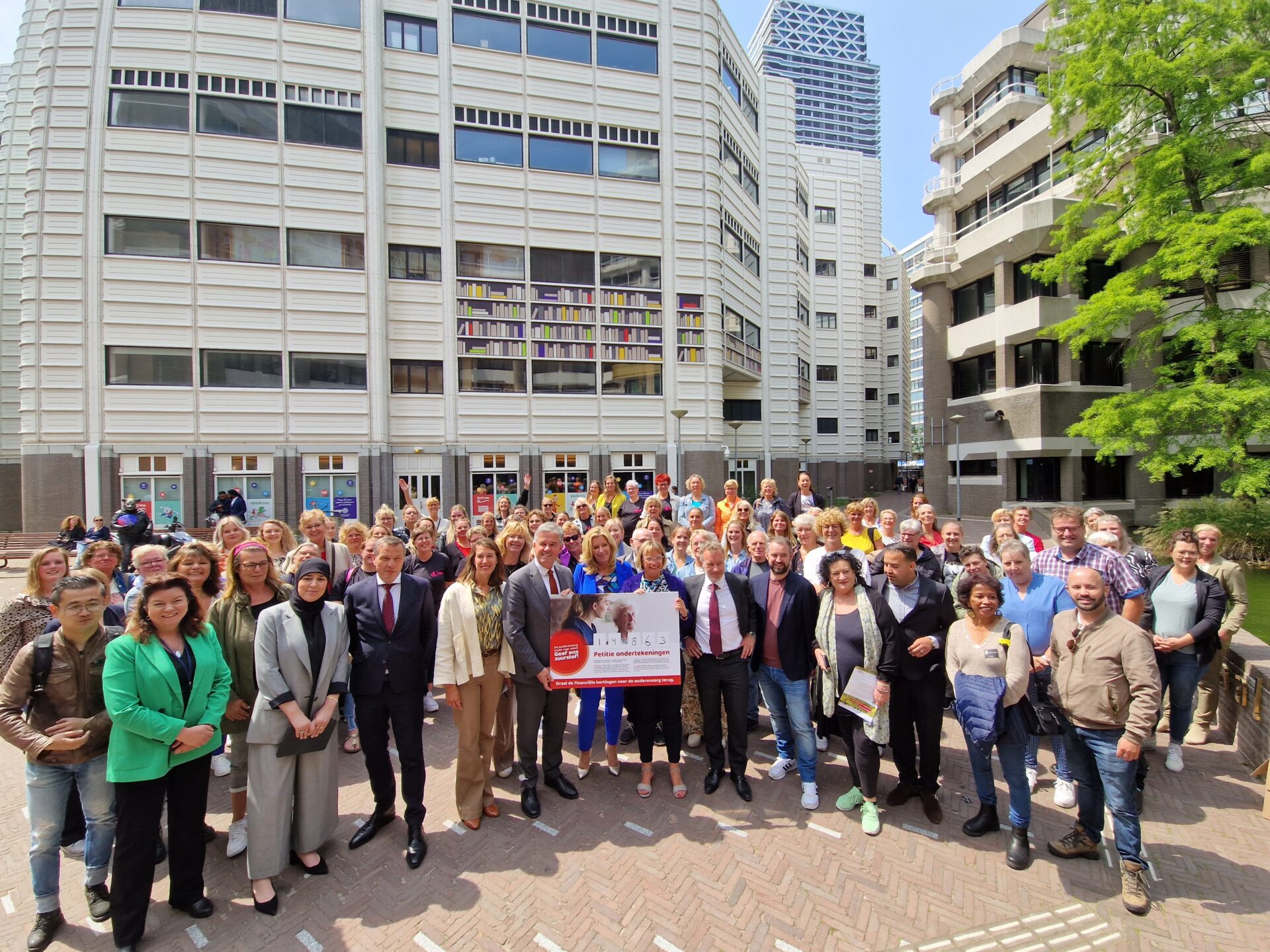 04 / 07 / 2023Vijftien duizend handtekeningen. Met die steun in de rug stapten ongeveer 100 medewerkers van Noordelijke ouderenzorginstellingen vandaag in de bus naar Den Haag. Samen overhandigden zij een petitie aan een aantal Tweede Kamerleden in Den Haag en minister Helder (Langdurige Zorg).
